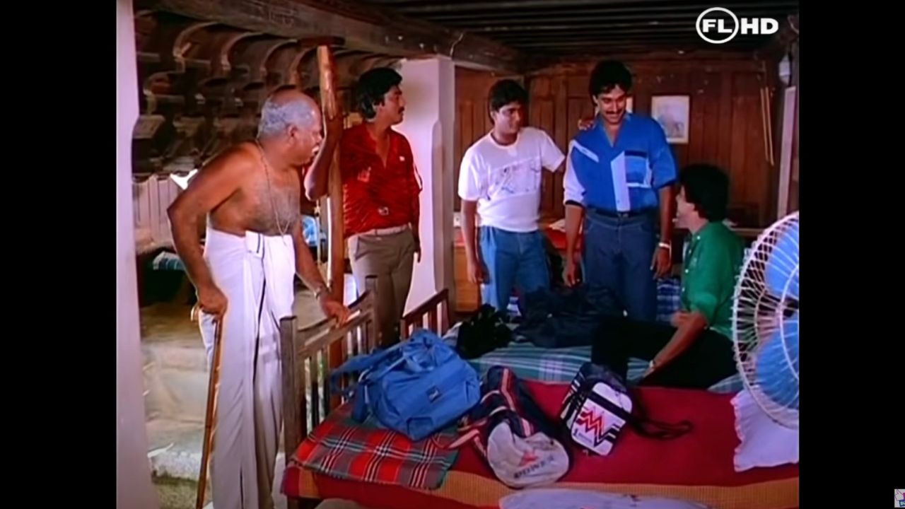 Bhasi, also known as Pachu and portrayed by Jayaram, takes on the role of Thampi’s grandson in the movie. With a genuinely innocent nature, Bhasi exudes an abundance of love for his grandfather. Eager to spend his vacation with Thampi, he brings along his friends—Ranjith (played by Ashokan), Lopez (played by Rahman), and Krishnankutti.